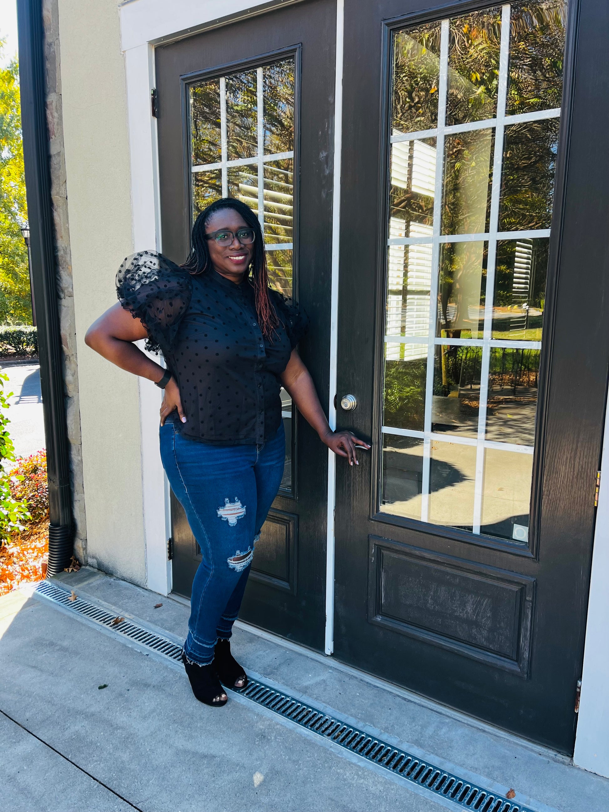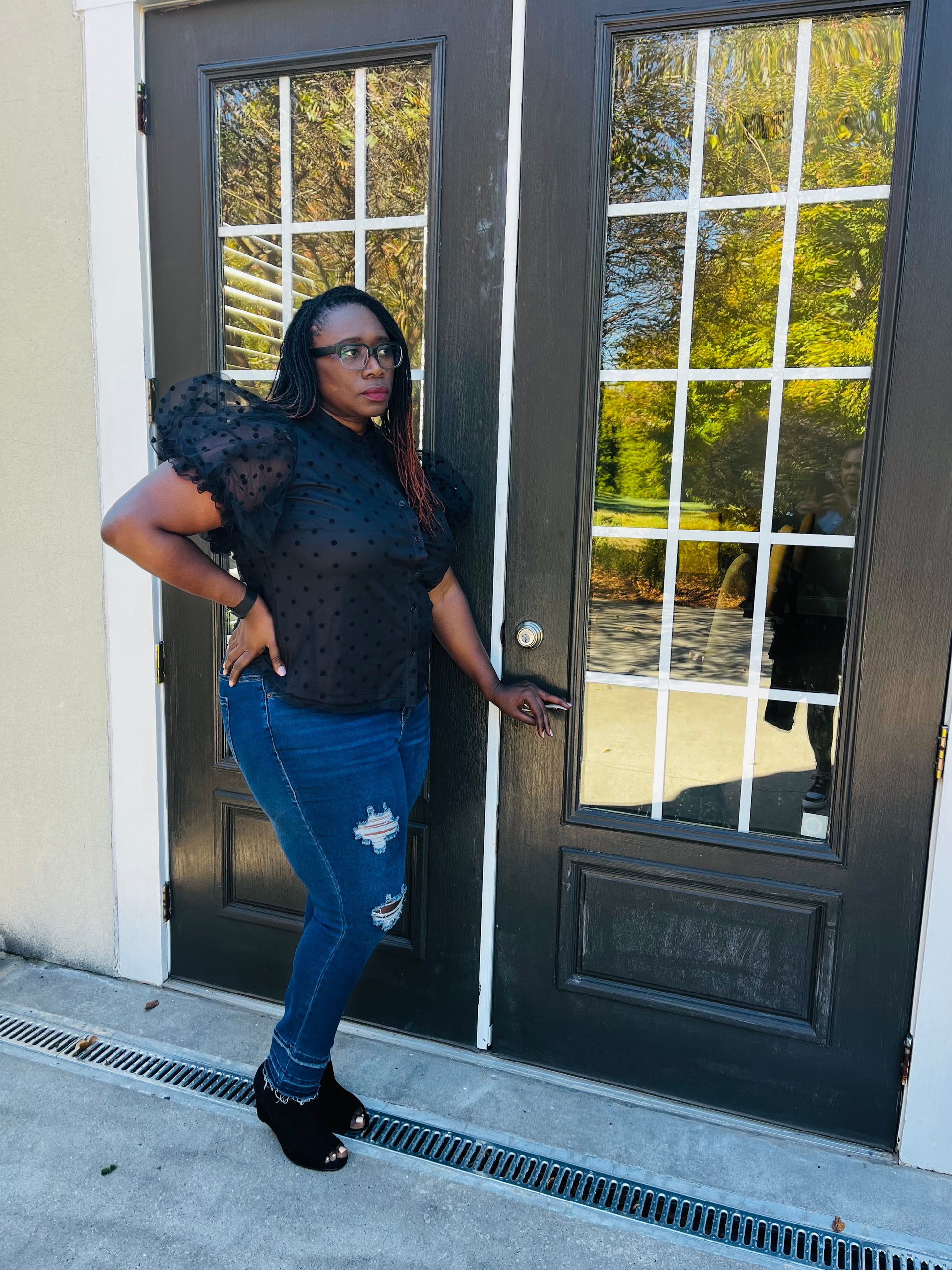 A dot mesh knit shirt featuring a banded collar, button-front closure, sheer short puff sleeves and lined front.