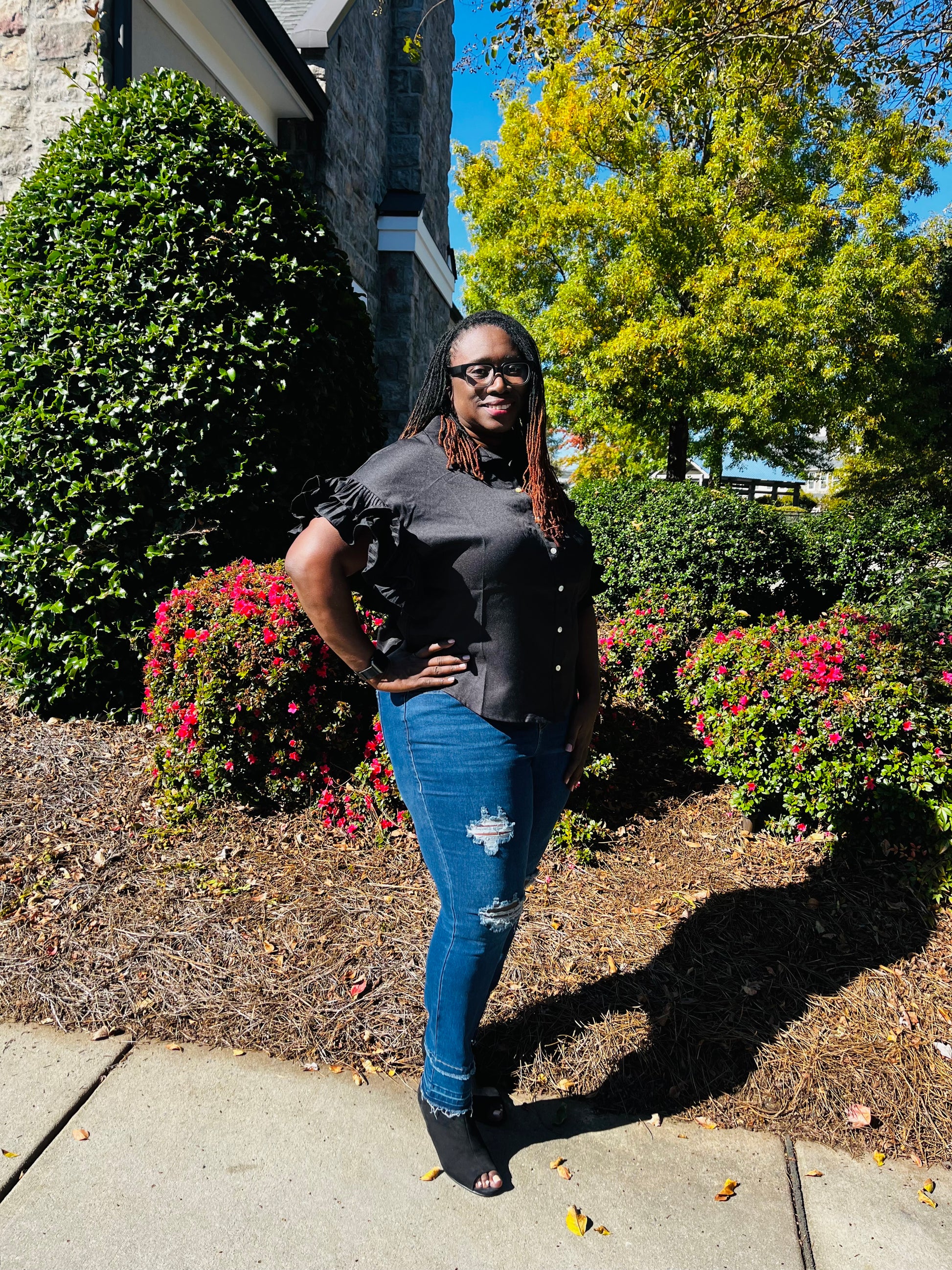 A woven shirt featuring a basic collar, button-front closure , dolman shirt sleeves with pleated ruffle trim and dolphin hem.